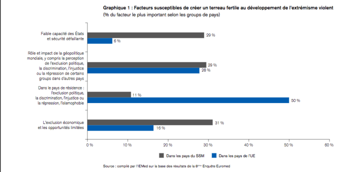 Analyser les dimensions idéologiques du djihadisme est un exercice polémique. L’enquête Euromed n’accorde qu’une place relative à cette dimension tout en laissant la possibilité aux participants d’y faire référence dans le cadre de questions ouvertes. Il est malaisé pour de nombreux chercheurs, journalistes et politiques d’accepter qu’une telle violence puisse être politiquement ou religieusement fondée. Ceux-ci préfèrent donc l’expliquer par une situation de discrimination économique et sociale et en retreindre l’aspect politique aux cadres peu féconds de l’endoctrinement ou de la criminalité. Le facteur religieux lui n’est en général abordé que pour en signaler l’usurpation (« cela n’a rien à voir avec l’islam ») ou comme écho à l’incompatibilité culturelle (« Paris est une fête ») et civilisationnelle (« why do they hate us ? ») des « fous de Dieu ».