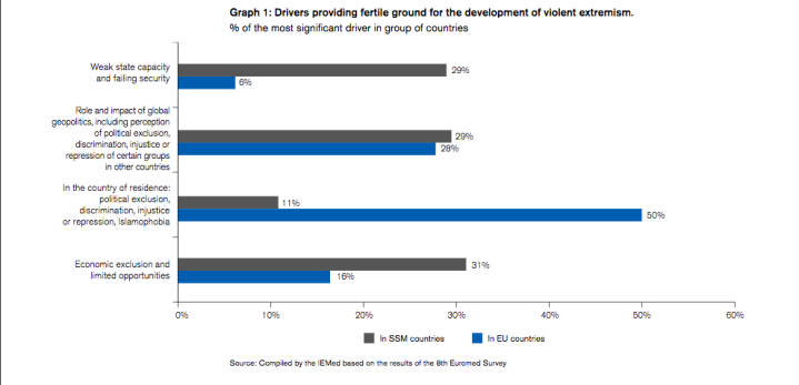All Jihadists recognise a religious foundation in their action but this is difficult to interpret through the methodological approaches and the scales of observation currently chosen to analyse violent extremism. For instance the ideological religious dimension does not come through in question 5 of the Euromed Survey as mentioned in some open answers (see Graph 1).