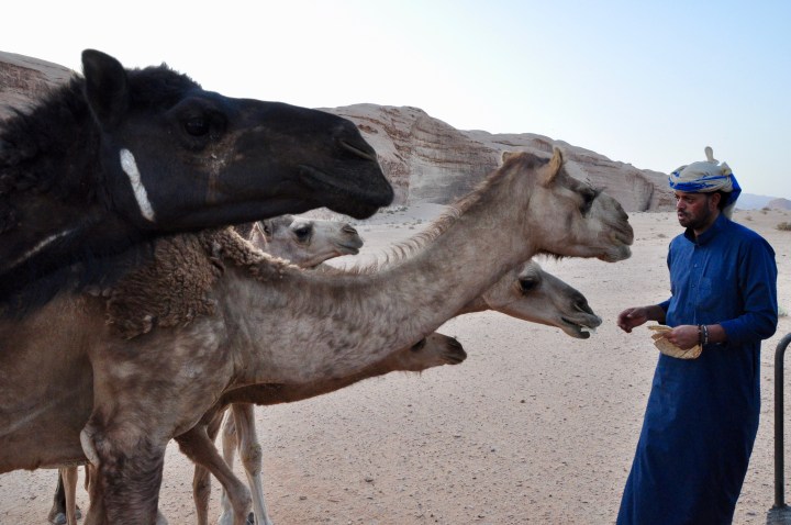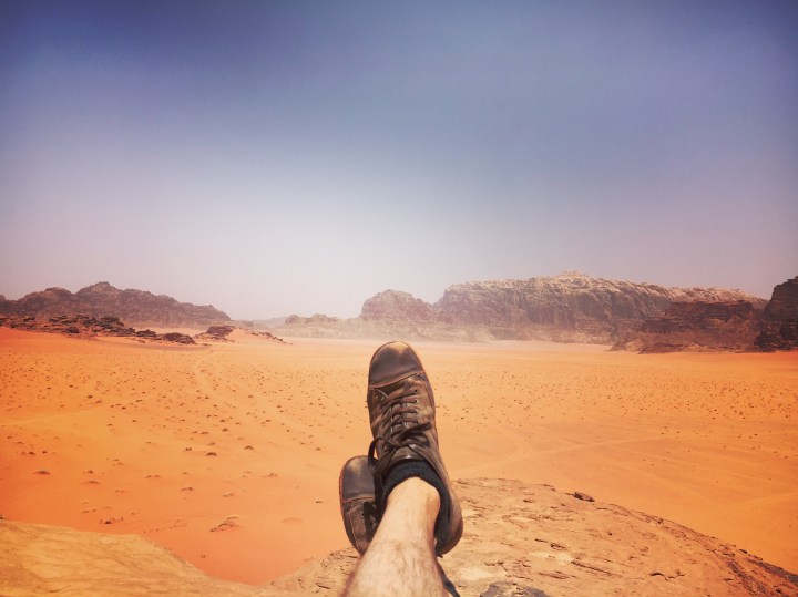 Il ne tient pas en dire plus sur tout ce qui est politique. Le roi, le gouvernement, Israël, l’Etat islamique, tout ça, c’est loin de lui et de ses préoccupations quotidiennes. En tout cas, il le prétend. Tout juste abandonne-t-il pêle-mêle que le roi est moins à blâmer que les gouvernements corrompus qui se succèdent, que personne n’aime le voisin saoudien et son arrogance, que Daesh aurait vainement tenté de rallier certaines tribus de Jordanie à son combat, que les exilés palestiniens sont autant un problème que la menace sioniste, que les Américains sont les bienvenus tant qu’ils ont des dollars à dépenser par ici… Etc. Son regard s’assombrit alors que s’empile ces affirmations déposées comme autant d’offrandes à ma curiosité toute journalistique. Comme si j’avais payé pour cela aussi. Mais, non, parler de tout cela ne lui plait pas. Pourtant, je sens bien qu’il aurait tant de choses à confier mais qu’il n’en fera rien car ce Harfi, après tout, il est bien sympathique mais qui est-il vraiment ? La confiance ne se donne pas, elle se gagne. Et je sens bien qu’il faudrait bien plus que mille repas comme celui-ci dans le désert pour que mon interlocuteur s’ouvre pleinement à moi. Je n’insiste pas.